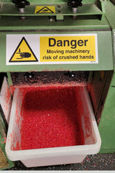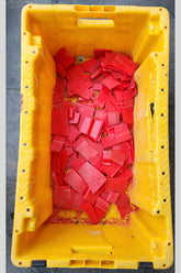 We collect, wash and shred each box in house. Then we mould the shredded plastic into the hands for our knives. Each handle has a marbling pattern from the mix of waste plastic which is difficult to predict making each piece unique.