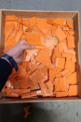 We collect, wash and shred each box in house. Then we mould the shredded plastic into the hands for our knives. Each handle has a marbling pattern from the mix of waste plastic which is difficult to predict making each piece unique.